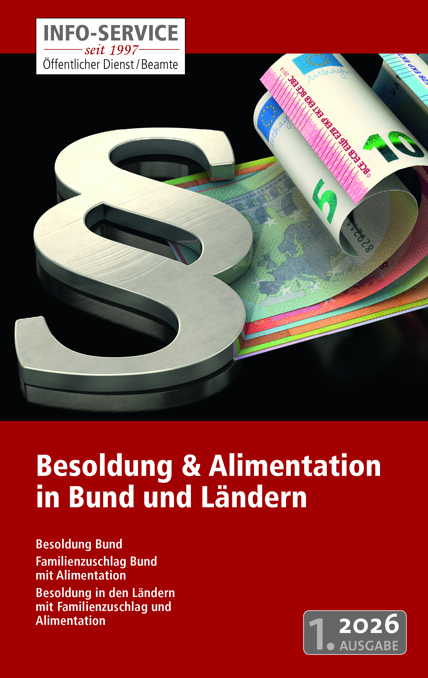 Neu: Besoldung & Alimentation in Bund und Ländern In Kürze wird die Bundesregierung einen Gesetzentwurf vorlegen, mit dem das Tarifergebnis vom Frühjahr 2024 auf den Beamten-bereich des Bundes übertragen werden soll. Die Besoldung soll neu justiert werden, u.a. soll es eine neue Besoldungstabelle geben. Daneben soll endlich die amtsangemessene Alimentation verfassungskonform umgesetzt werden. Beamtinnen und Beamte des Bundes können mit erheblichen Nachzahlungen rechnen. Für Bundesbeamte mit zwei und mehr Kindern kann es fünfstellige Nachzahlungen geben. Im November 2025 hatte das BVerfG entschieden, die Beamtenbesoldung im Land Berlin für die Jahre 2008 bis 2020 in den Besoldungsgruppen A nachzuzahlen, weil das Beliner Gesetz „weit überwiegend verfassungswidrig“ und nicht „amtsangemessen“ war. Es wird erwartet, dass die Bundesregierung dieses Urteil bei ihrem Gesetzenwtwurf berücksichtigt. Der INFO-SERVICE wird eine rund 100-seitige Broschüre herausgeben, sobald der Gesetzentwurf vorlegt (wahrscheinlich im 1. Quartal 2026). Die Broschüre wird auch den Sachstand der Länder beinhalten. Vorbestellung >>>zum Vorzuugspreis |